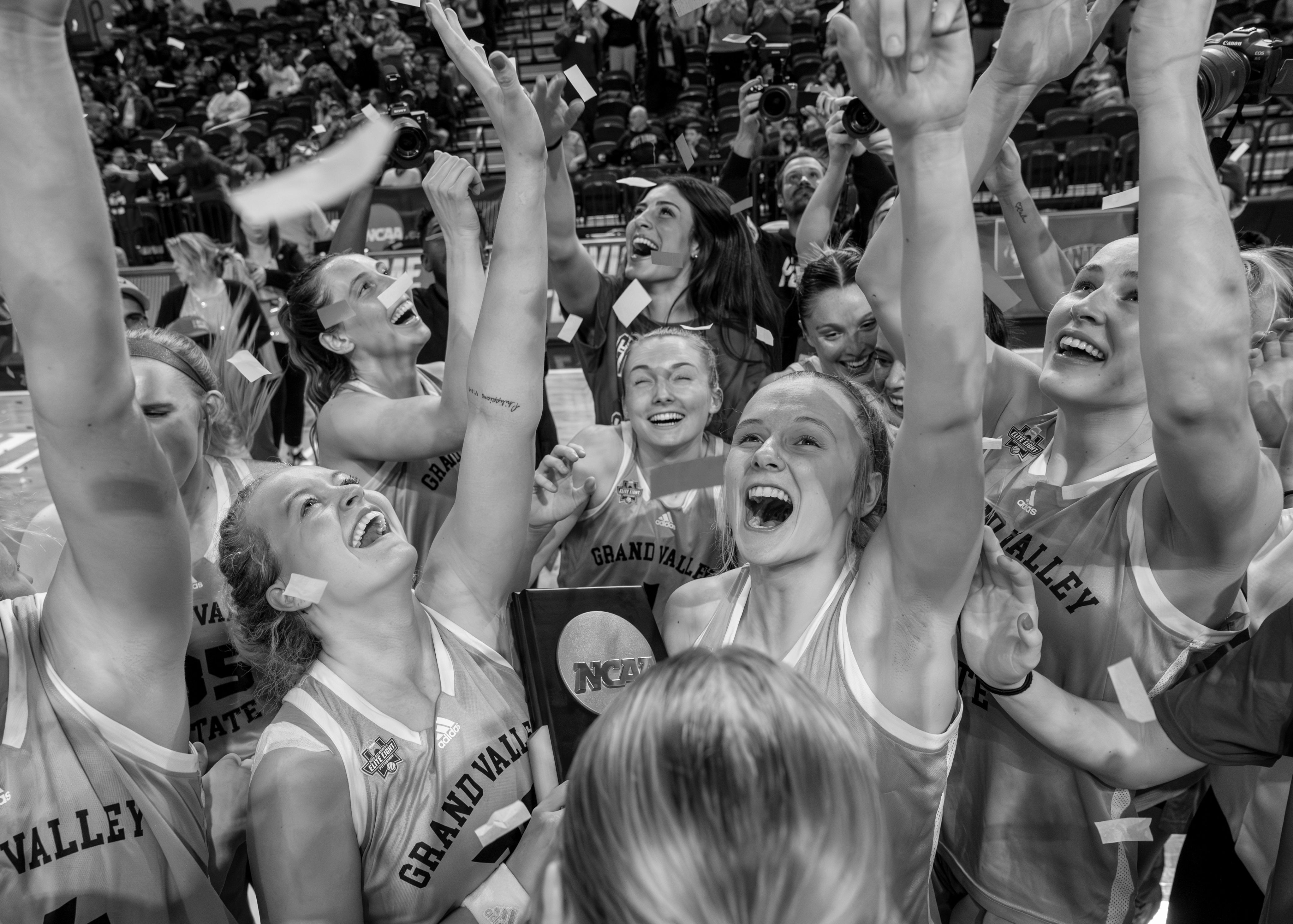 GVSU celebrates the 70-58 win over Cal-State Dominguez Hills in the NCAA Division II National Championship at the UPMC Cooper Fieldhouse in Pittsburgh on March 28. (Photo by Cory Morse)