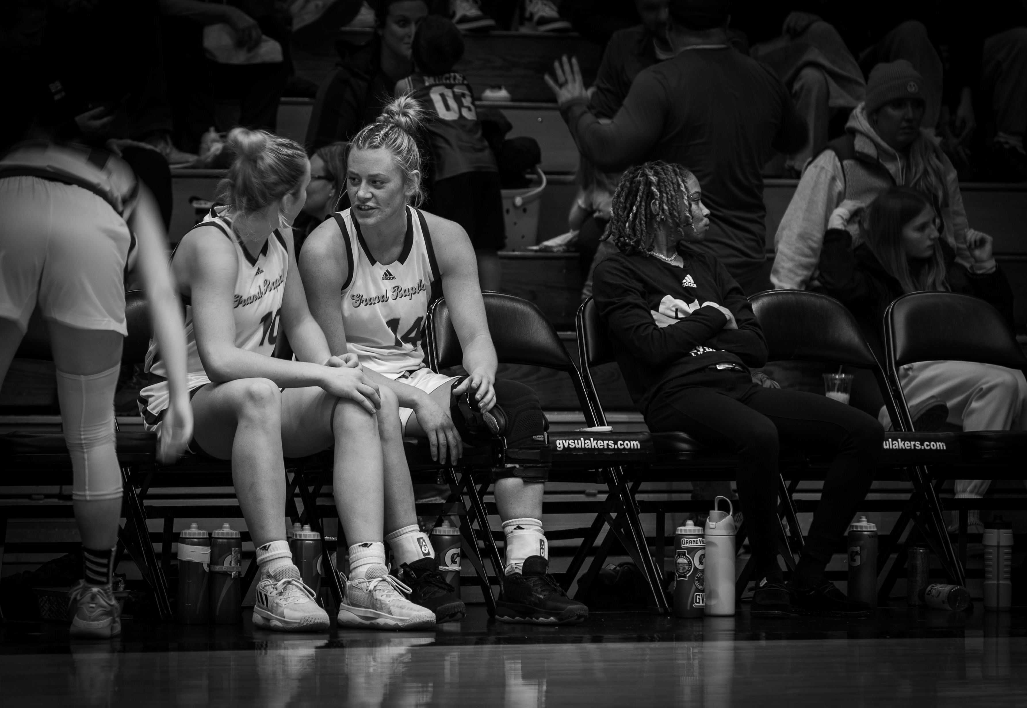 Ellie Droste, left, and Hadley Miller, standing, react to a call made by the officials during the women's basketball game against Wayne State University February 20. Grand Valley defeated Wayne State at home 85-67 to win their fourth straight GLIAC title.
