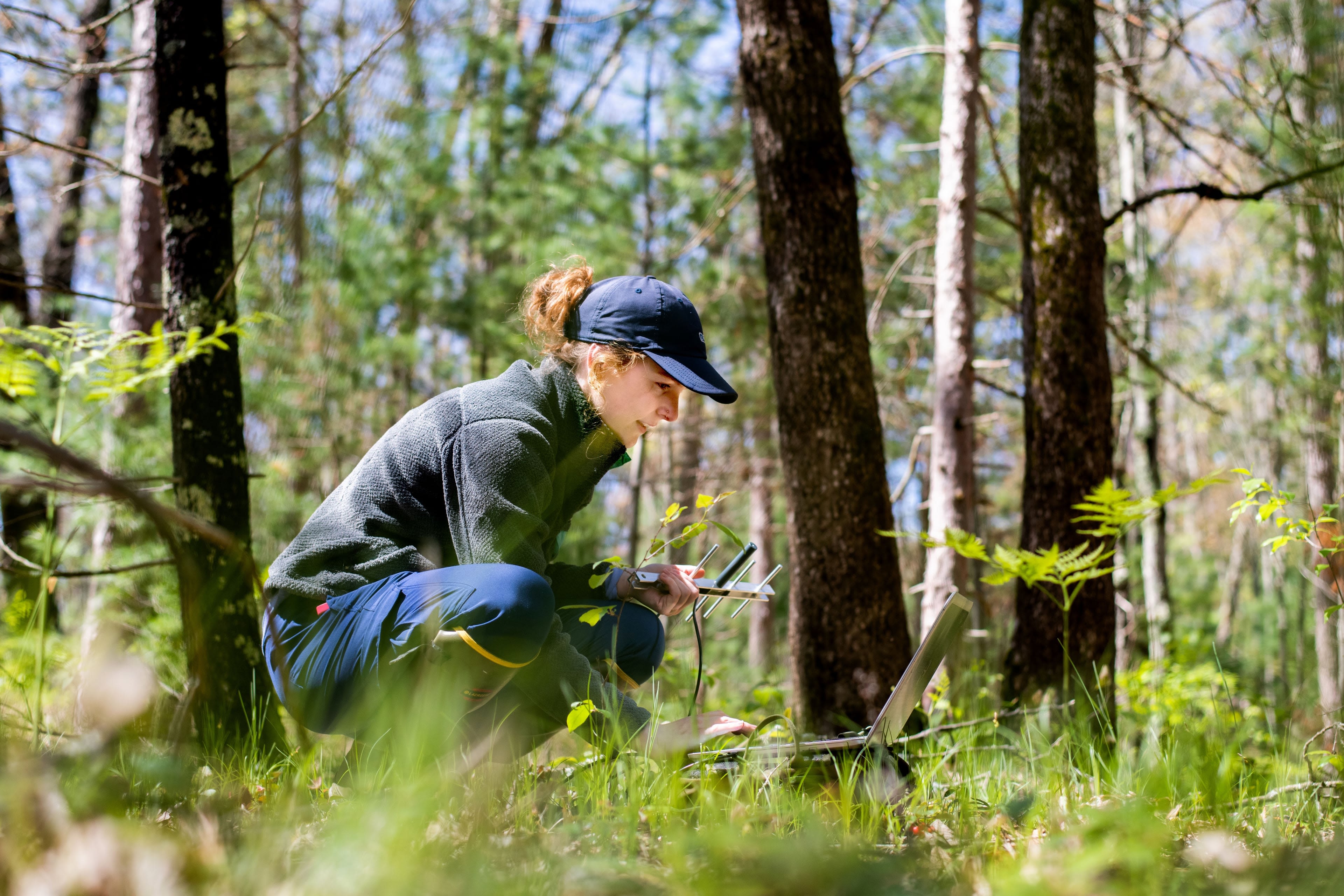 Erin Trimpe, biology graduate student, swaps out a transmitter on a wood turtle while doing research on wood turtles and raccoons in the Manistee National Forest.