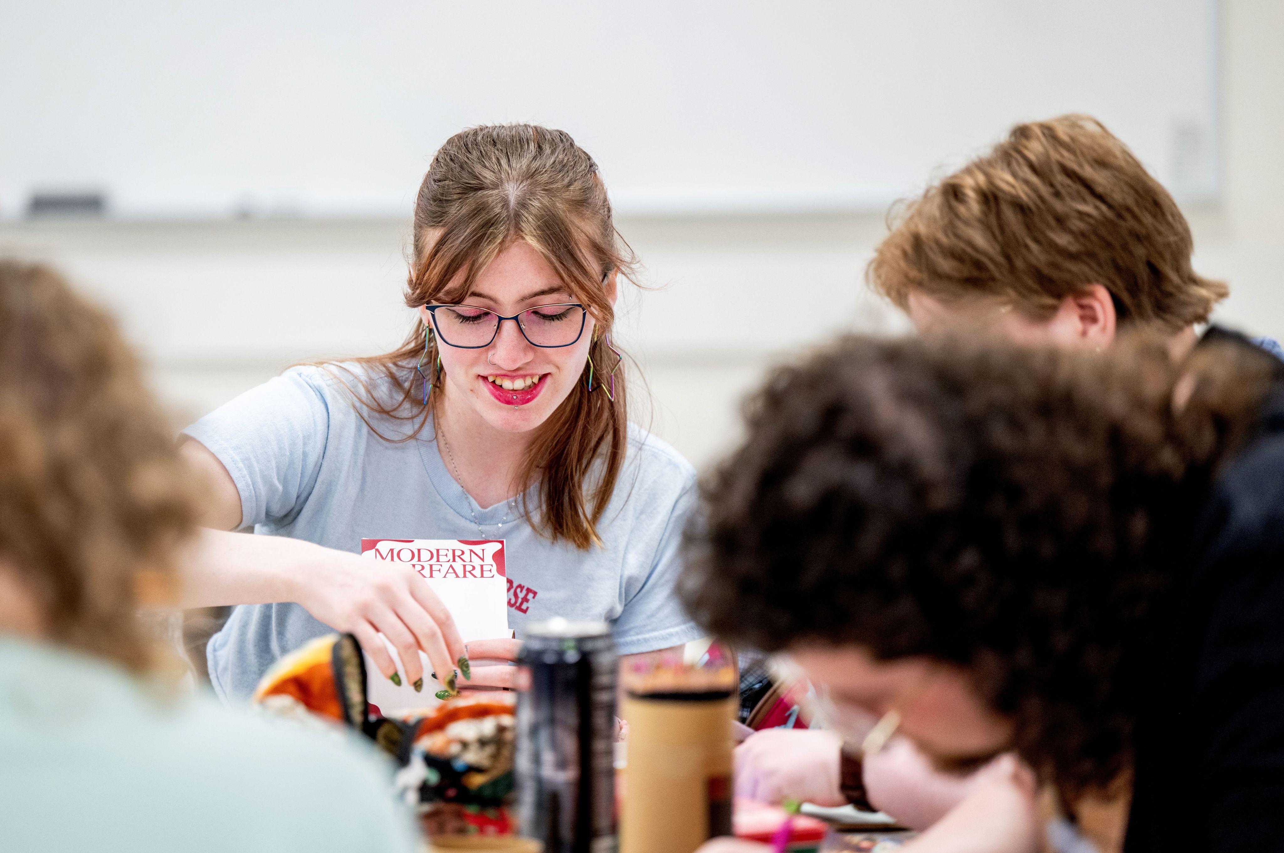 During a recent Thursday morning class, students in Melissa Morison’s Classics 395/495 huddled in small groups, putting the final touches on their Student Scholars Day projects ahead of the April 8 event. Morison offered guidance and encouragement as she moved between groups.