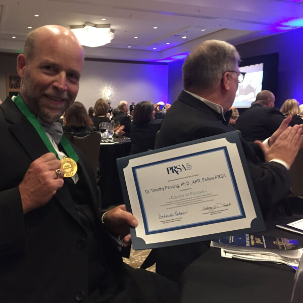 The Public Relations Society of America recently inducted new members into its prestigious College of Fellows, one of which was a Grand Valley faculty member. Along with 10 other professionals, Tim Penning, professor of advertising and public relations, was inducted into the organization during a special ceremony on October 6 at the PRSA International Conference in Austin, Texas.