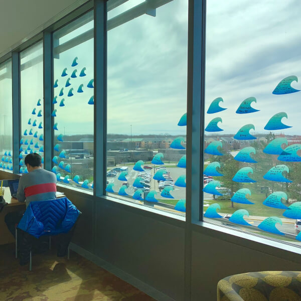 About 1,000 "waves of wishes" are displayed on the library windows, wishing students good luck during finals week.
