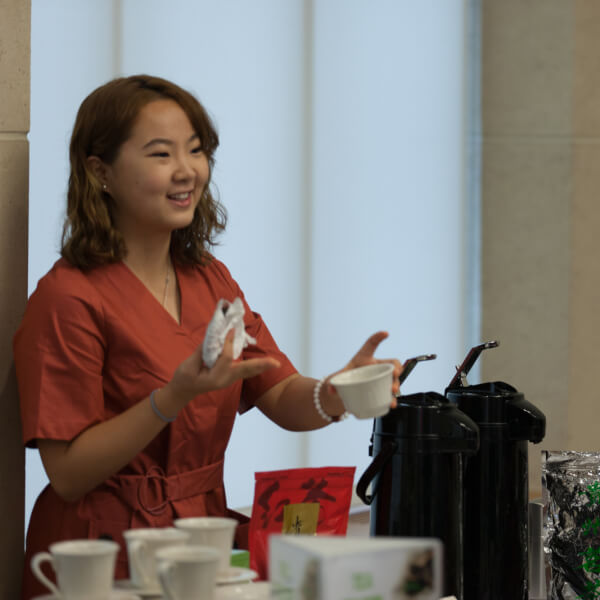 Ruixuan Ran, a senior from China who is majoring in accounting and international business, hosted a tea table for area business leaders who are learning best practices for doing business abroad.