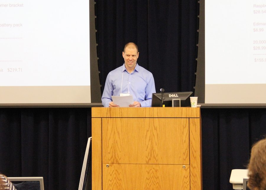 Connor Payne references his slides during the pitch.