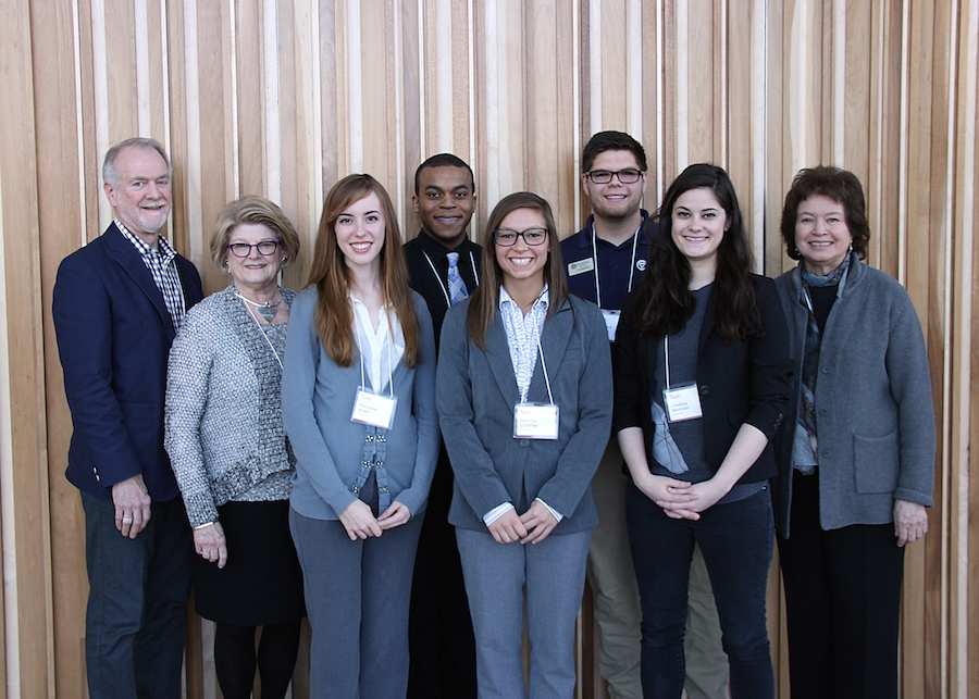 The competition winners pose with the final-round judges: Lee VanOrsdel, Dean of Libraries, Provost Gail Davis, John Berry, and Lindsay Noonan.