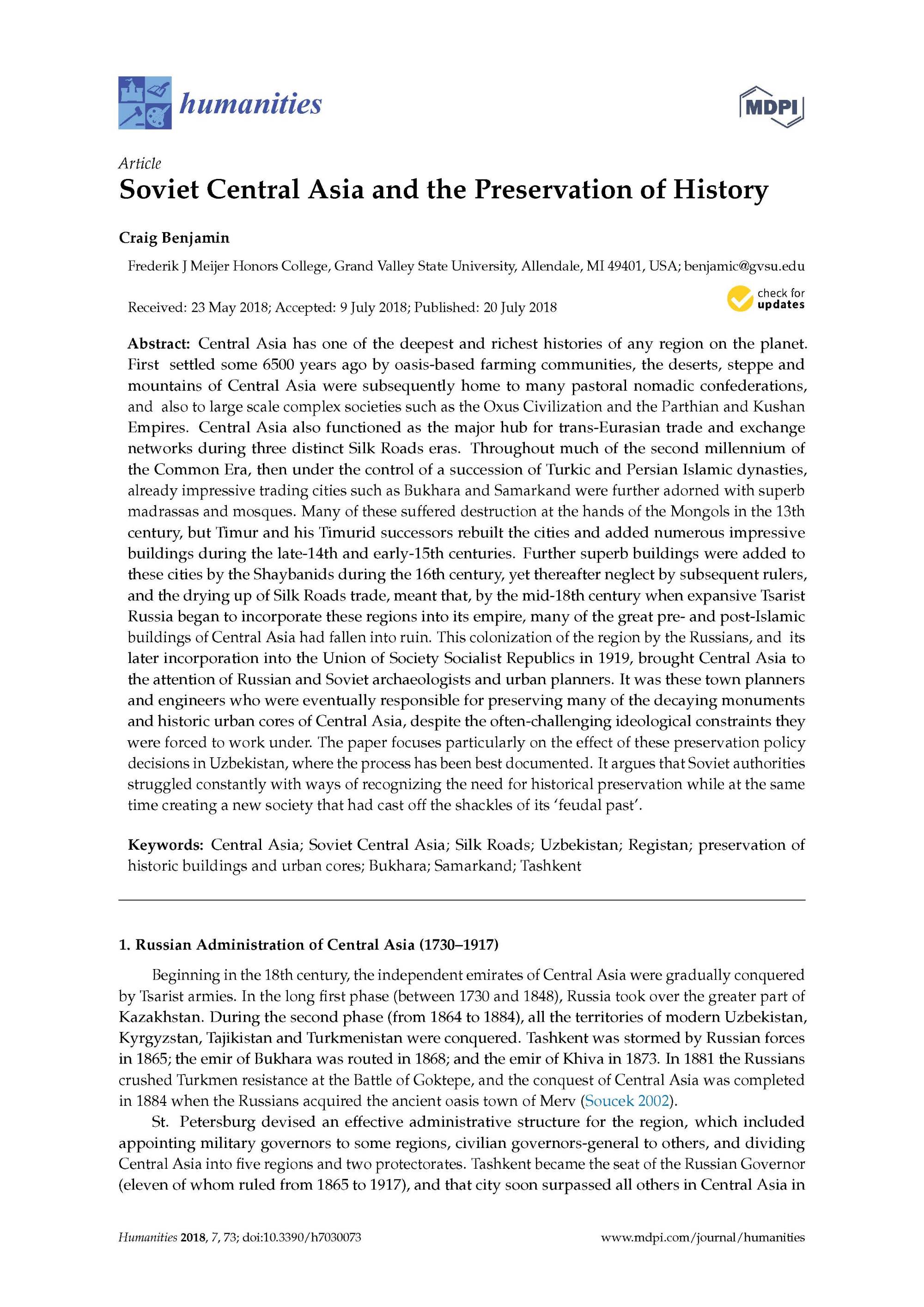 Central Asia has one of the deepest and richest histories of any region on the planet. First settled some 6500 years ago by oasis-based farming communities, the deserts, steppe and mountains of Central Asia were subsequently home to many pastoral nomadic confederations, and also to large scale complex societies such as the Oxus Civilization and the Parthian and Kushan Empires. Central Asia also functioned as the major hub for trans-Eurasian trade and exchange networks during three distinct Silk Roads eras. Throughout much of the second millennium of the Common Era, then under the control of a succession of Turkic and Persian Islamic dynasties, already impressive trading cities such as Bukhara and Samarkand were further adorned with superb madrassas and mosques. Many of these suffered destruction at the hands of the Mongols in the 13th century, but Timur and his Timurid successors rebuilt the cities and added numerous impressive buildings during the late-14th and early-15th centuries. Further superb buildings were added to these cities by the Shaybanids during the 16th century, yet thereafter neglect by subsequent rulers, and the drying up of Silk Roads trade, meant that, by the mid-18th century when expansive Tsarist Russia began to incorporate these regions into its empire, many of the great pre- and post-Islamic buildings of Central Asia had fallen into ruin. This colonization of the region by the Russians, and its later incorporation into the Union of Society Socialist Republics in 1919, brought Central Asia to the attention of Russian and Soviet archaeologists and urban planners. It was these town planners and engineers who were eventually responsible for preserving many of the decaying monuments and historic urban cores of Central Asia, despite the often-challenging ideological constraints they were forced to work under. The paper focuses particularly on the effect of these preservation policy decisions in Uzbekistan, where the process has been best documented. It argues that Soviet authorities struggled constantly with ways of recognizing the need for historical preservation while at the same time creating a new society that had cast off the shackles of its ‘feudal past’.