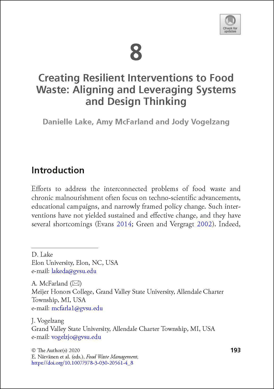 Food waste interventions often end up shifting waste instead of reducing it. In their chapter, Danielle Lake, Amy McFarland, and Jody Vogelzang suggest efforts to ameliorate the food waste crisis could be better served through integrating theories and tools from systems thinking and design thinking. They analyse several systemic influences on food change and then recommend ten practical strategies for fostering and supporting change agents. Lake et al. suggest these ten intervention strategies will help change agents uncover and leverage the otherwise hidden interconnections between social, economic, and political systems. These strategies may open opportunities to address the underlying factors contributing to food waste and yield more inclusive, effective, and sustainable change.