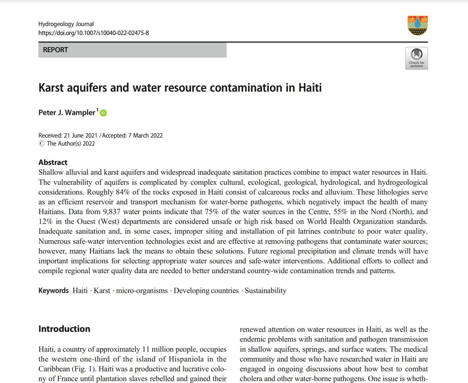 Check out Dr. Peter Wampler's recent publication in the Hydrogeology Journal! Dr. Wampler explained that "this article, entitled 'Karst aquifers and water resource contamination in Haiti', has been a few COVID-crazed years in the making, but I am happy that it is finally published and openly accessible to all through open access publication. It is part of a special issue about Haiti".