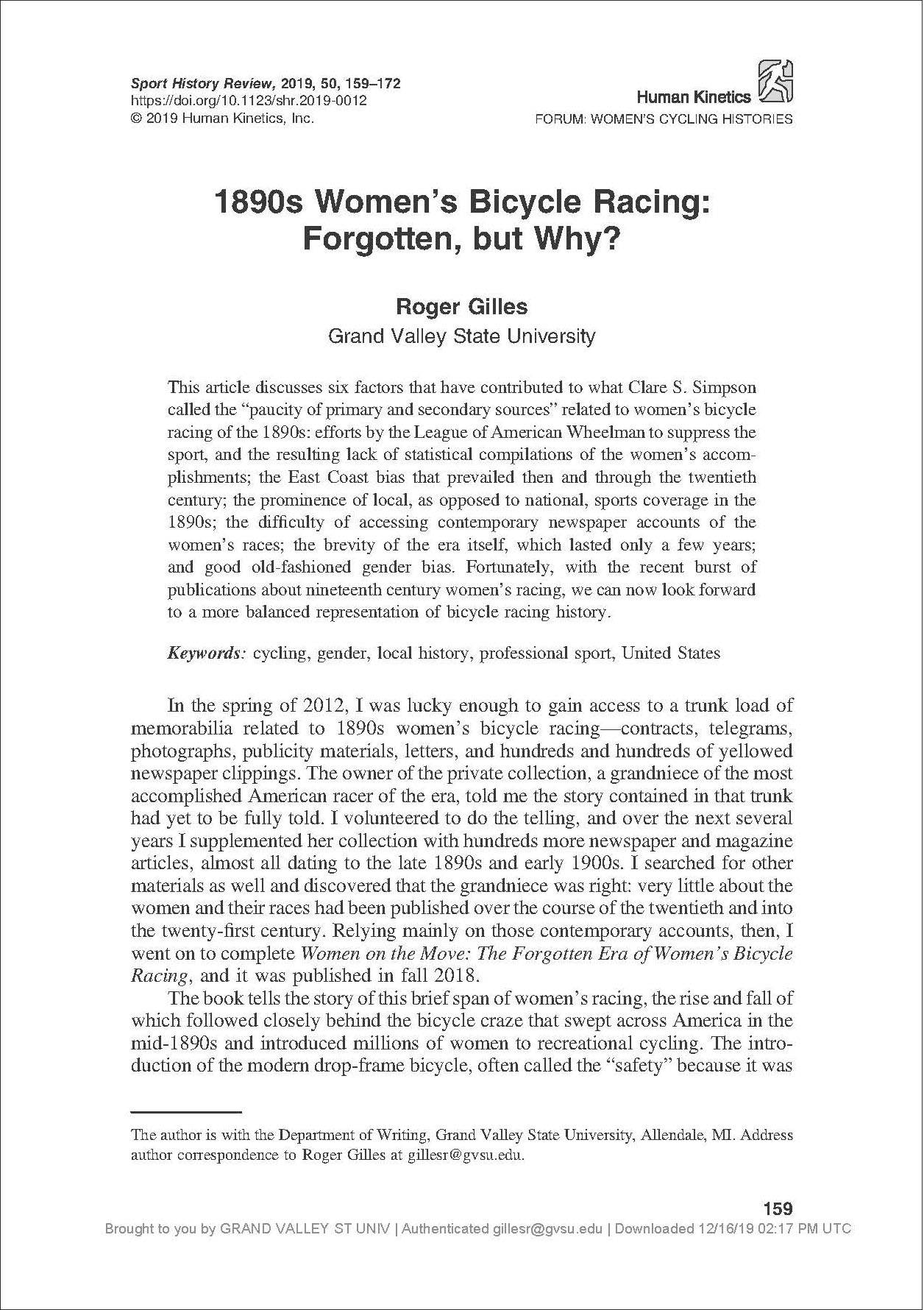 This article discusses six factors that have contributed to what Clare S. Simpson called the “paucity of primary and secondary sources” related to women’s bicycle racing of the 1890s: efforts by the League of American Wheelman to suppress the sport, and the resulting lack of statistical compilations of the women’s accomplishments; the East Coast bias that prevailed then and through the twentieth century; the prominence of local, as opposed to national, sports coverage in the 1890s; the difficulty of accessing contemporary newspaper accounts of the women’s races; the brevity of the era itself, which lasted only a few years; and good old-fashioned gender bias. Fortunately, with the recent burst publications about nineteenth century women’s racing, we can now look forward to a more balanced representation of bicycle racing history.