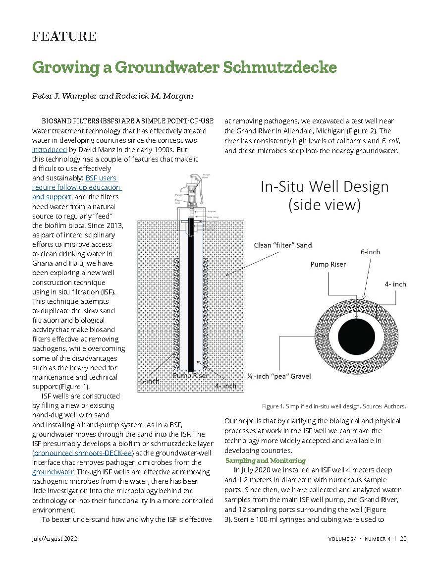 Biosand filters are a simple point-of-use water treatment technology that has effectively treated water in developing countries since the concept was introduced in the early 1990s. But the technology has a couple of features that make it difficult to use effectively and sustainably. Since 2013, as part of interdisciplinary efforts to improve access to clean drinking water in Ghana and Haiti, Wampler and Morgan have been exploring a new well contruction technique using in situ filtration. This technique duplicates the slow sand filtration and biological activity that make biosand filters effective while overcoming some of the disadvantages of the technique.
