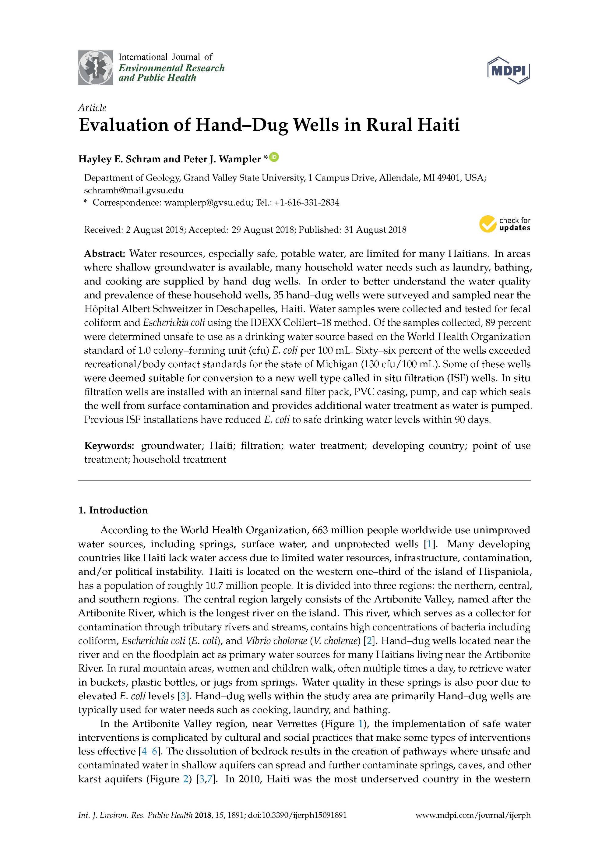 Water resources, especially safe, potable water, are limited for many Haitians. In areas where shallow groundwater is available, many household water needs such as laundry, bathing, and cooking are supplied by hand–dug wells. In order to better understand the water quality and prevalence of these household wells, 35 hand–dug wells were surveyed and sampled near the Hôpital Albert Schweitzer in Deschapelles, Haiti. Water samples were collected and tested for fecal coliform and Escherichia coli using the IDEXX Colilert–18 method. Of the samples collected, 89 percent were determined unsafe to use as a drinking water source based on the World Health Organization standard of 1.0 colony–forming unit (cfu) E. coli per 100 mL. Sixty–six percent of the wells exceeded recreational/body contact standards for the state of Michigan (130 cfu/100 mL). Some of these wells were deemed suitable for conversion to a new well type called in situ filtration (ISF) wells. In situ filtration wells are installed with an internal sand filter pack, PVC casing, pump, and cap which seals the well from surface contamination and provides additional water treatment as water is pumped. Previous ISF installations have reduced E. coli to safe drinking water levels within 90 days.
