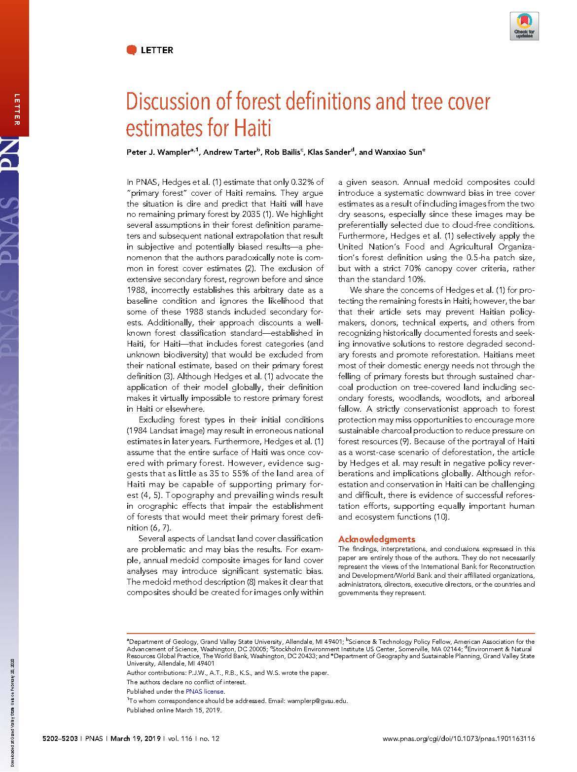 Hedges et al. estimate that only 0.32% of “primary forest” cover of Haiti remains. They argue the situation is dire and predict that Haiti will have no remaining primary forest by 2035. We highlight several assumptions in their forest definition parameters and subsequent national extrapolation that result in subjective and potentially biased results—a phenomenon that the authors paradoxically note is common in forest cover estimates. The exclusion of extensive secondary forest, regrown before and since 1988, incorrectly establishes this arbitrary date as a baseline condition and ignores the likelihood that some of these 1988 stands included secondary forests. Additionally, their approach discounts a well-known forest classification standard—established in Haiti, for Haiti—that includes forest categories (and unknown biodiversity) that would be excluded from their national estimate, based on their primary forest definition. Although Hedges et al. advocate the application of their model globally, their definition makes it virtually impossible to restore primary forest in Haiti or elsewhere.