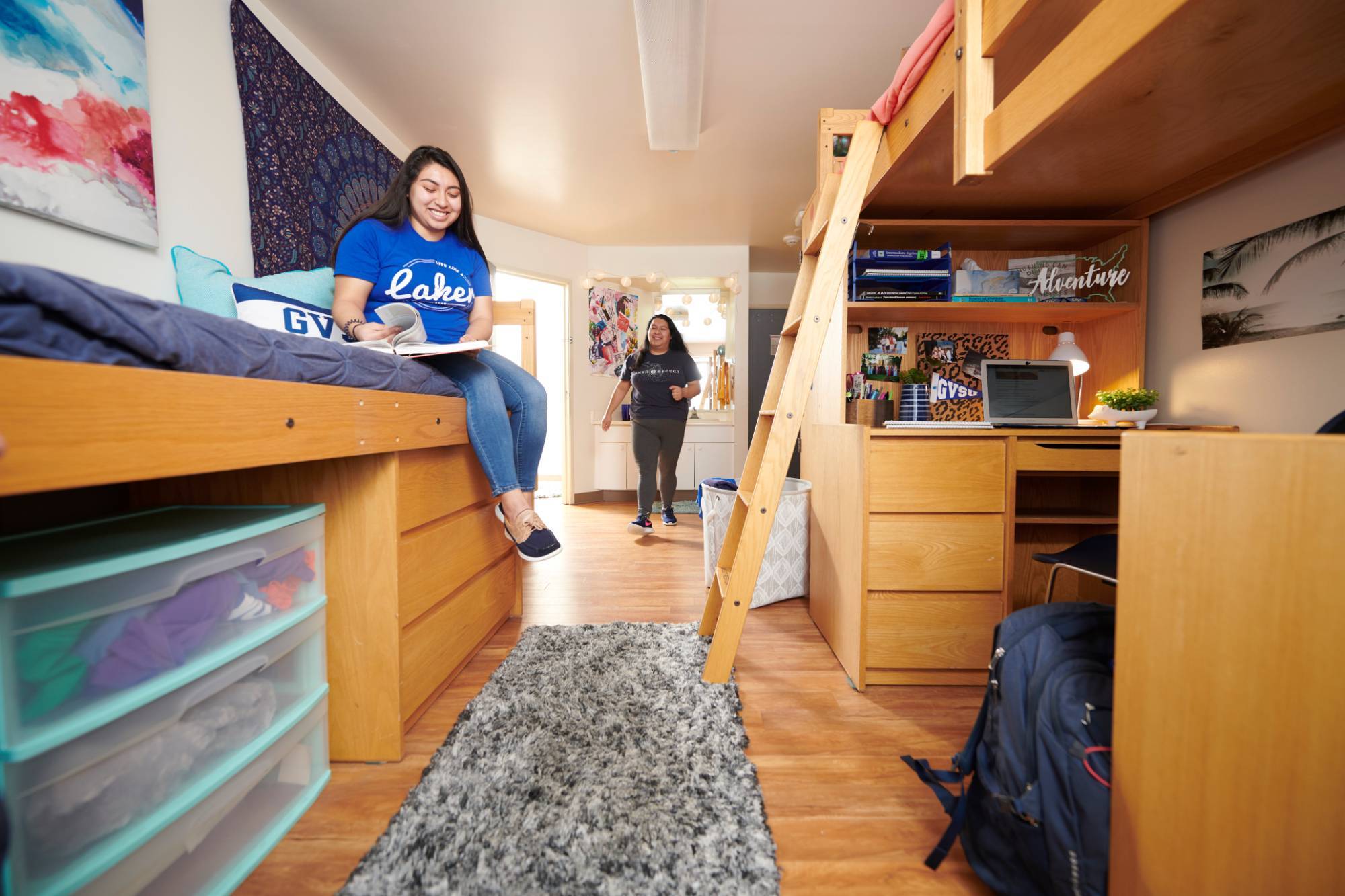 Suite-style units consist of two students per room, and four students per suite with a shared bathroom, reserved for freshmen. Two residents share a double fully furnished room with a sink. Suite-style is a great way to form a sense of community and relationships with other residents. This building is located in the North Campus Neighborhood near Kleiner Commons, the tutoring center, Fresh Food Co., Fuel, and Mackinac Hall, where most freshmen have classes. You may hear about Pickard, Pew, & DeVos as being a part of the PiCoDePew or PPDC community.