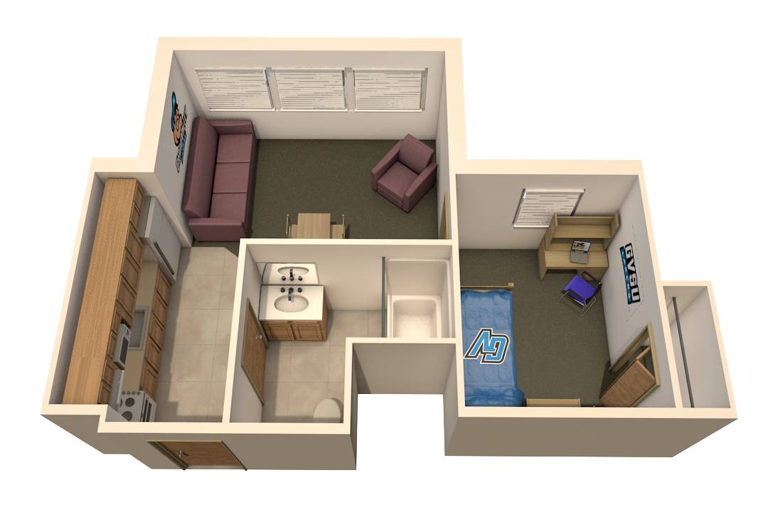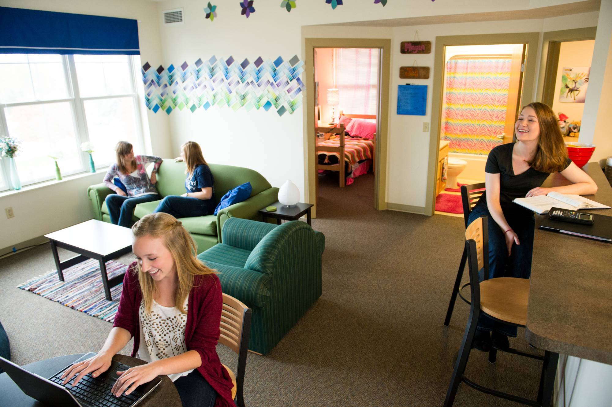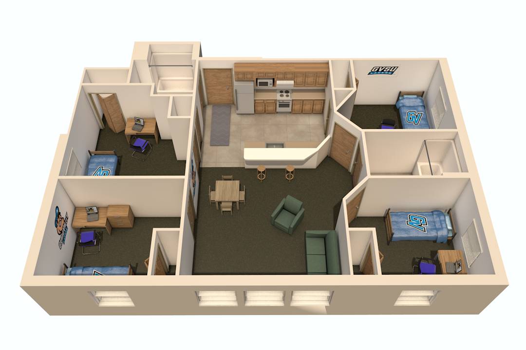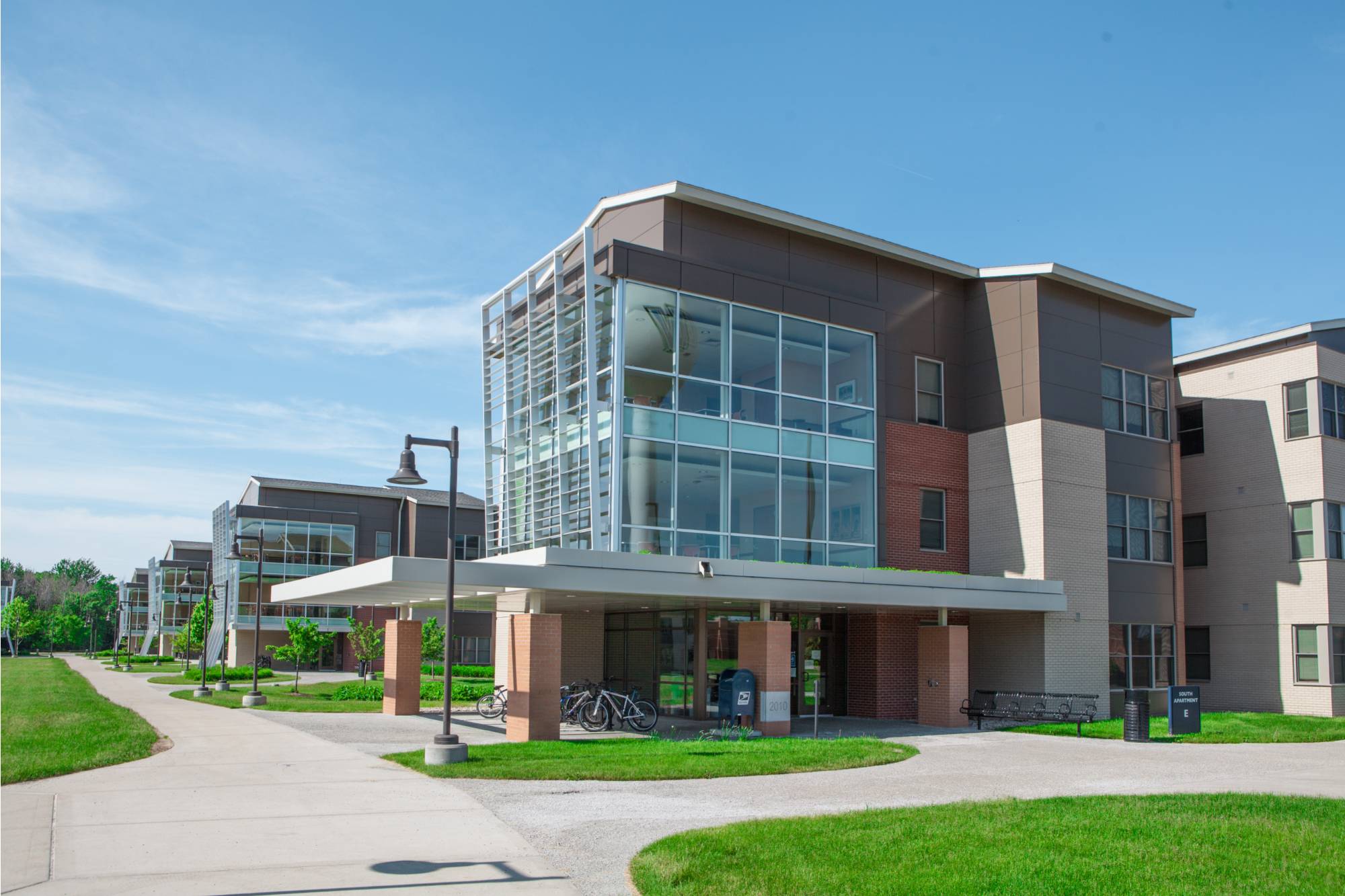 On-Campus apartments are fully furnished and primarily for returning residents, transfer students, and graduate students. First-year residents are able to reside in on-campus apartments if they choose to live in a Living Learning Community. On-campus apartments provide residents with increased privacy and space, while still being close and convenient to classes and campus resources. They are located on South campus near The Blue Connection, Library, Niemeyer Honors College, and the Kirkhof Center. Residents can enjoy the privacy of their own bedroom and additional living space, all while still enjoying the community that has been built. Outside, you will typically see students lounging or playing outdoor games.