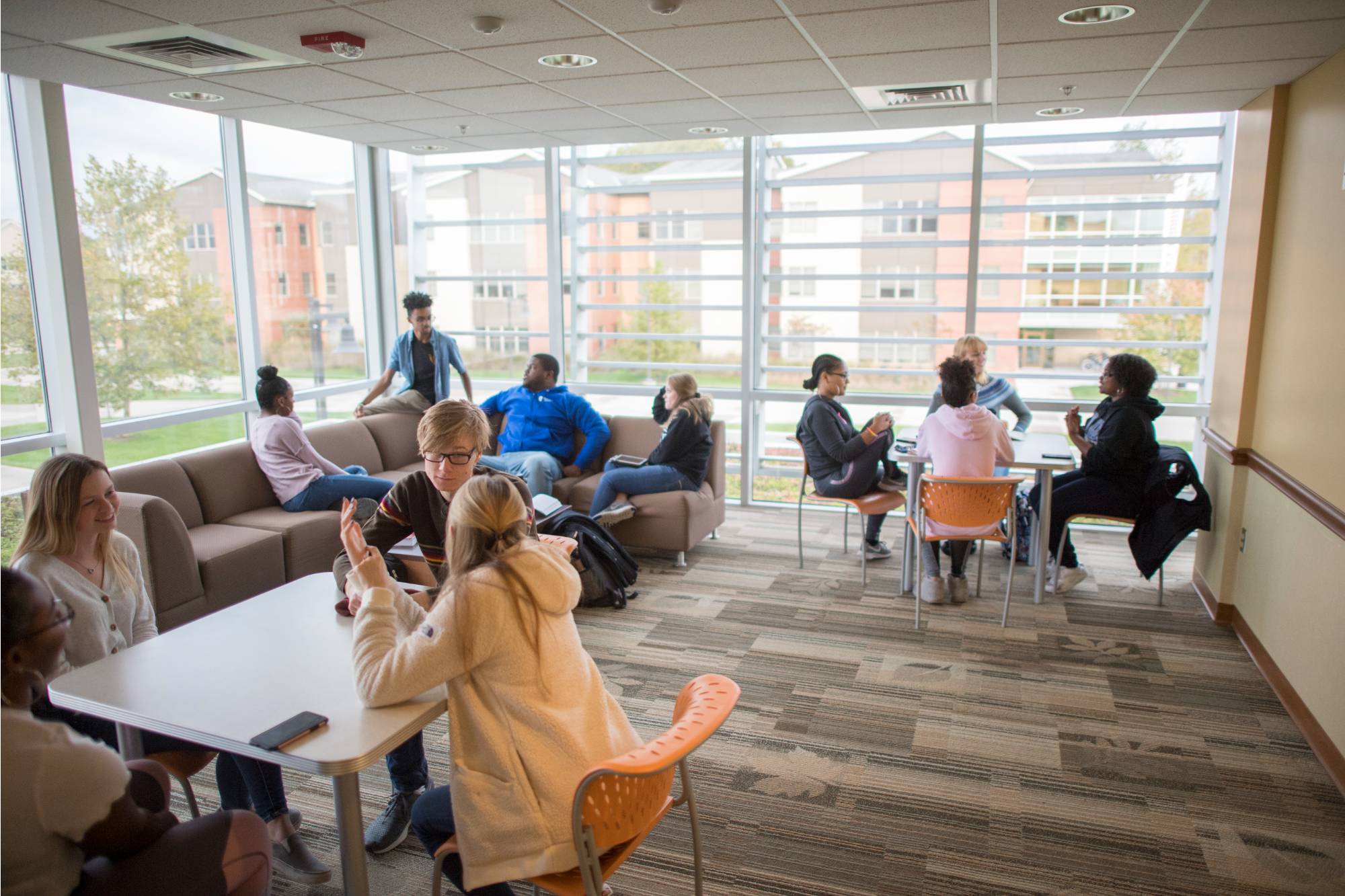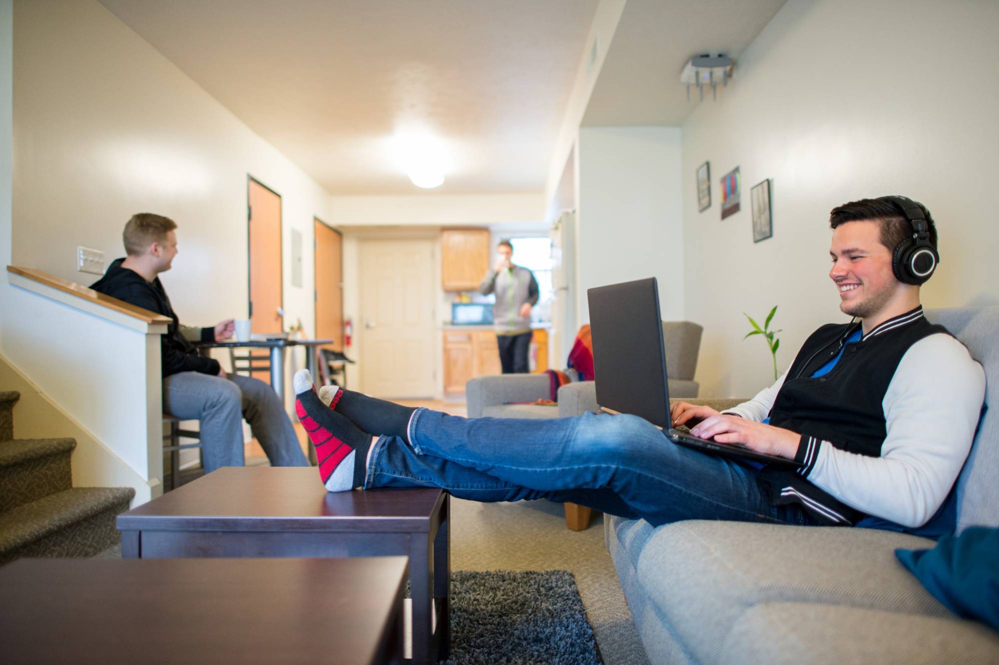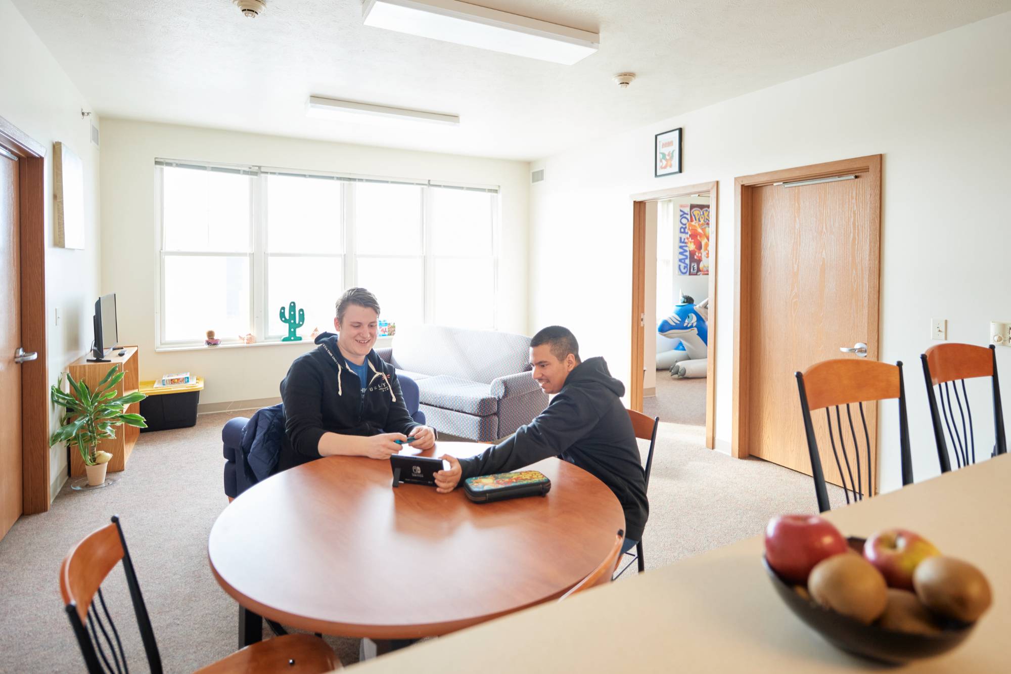 On-Campus apartments are fully furnished and primarily for returning residents, transfer students, and graduate students. First-year residents are able to reside in on-campus apartments if they choose to live in a Living Learning Community. On-campus apartments provide residents with increased privacy and space, while still being close and convenient to classes and campus resources. They are located on South campus near The Blue Connection, Library, Niemeyer Honors College, and the Kirkhof Center. Residents can enjoy the privacy of their own bedroom and additional living space, all while still enjoying the community that has been built. Outside, you will typically see students lounging or playing outdoor games.