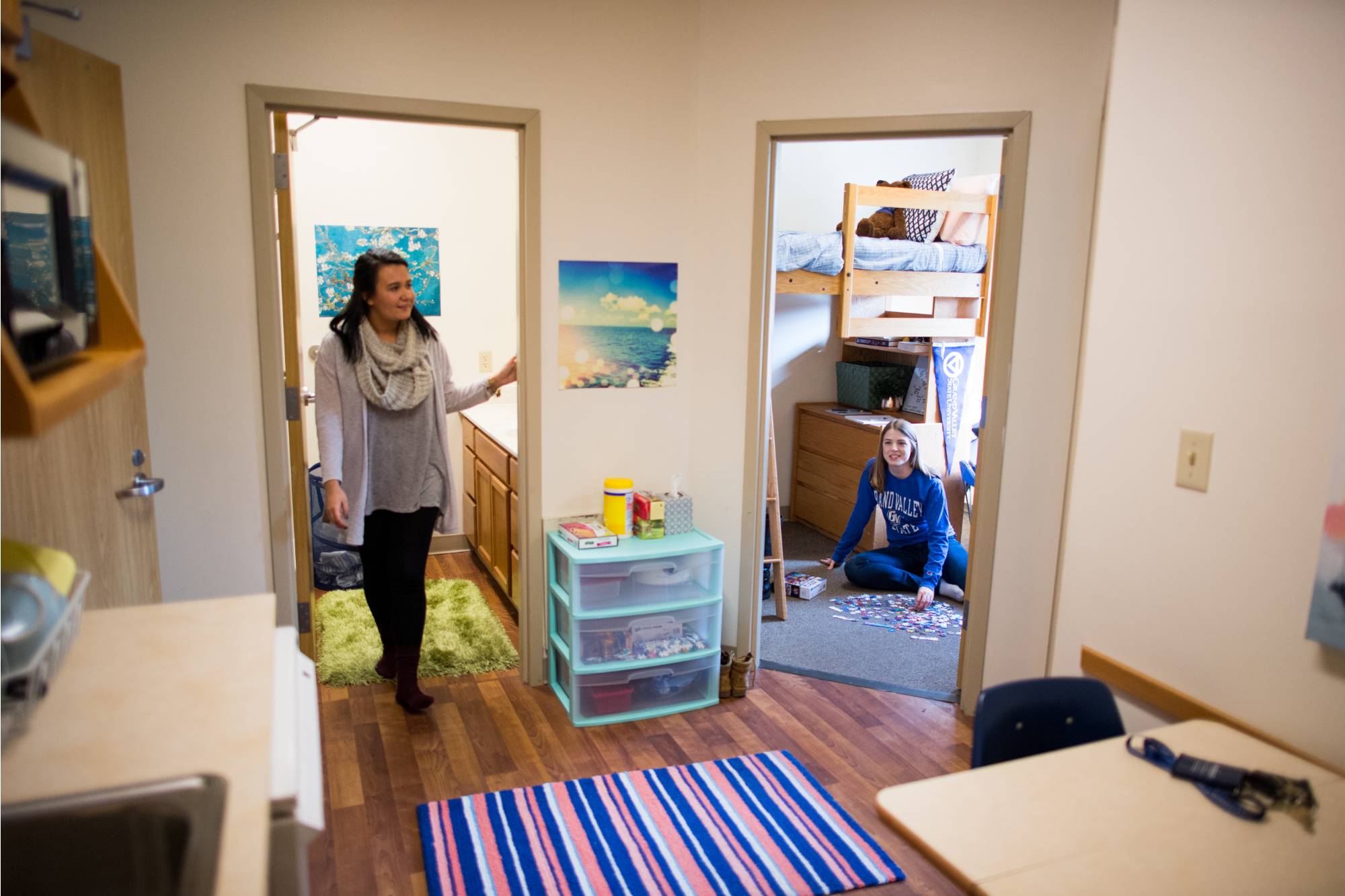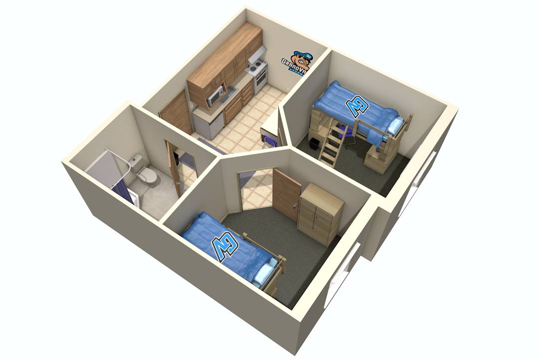 Two-bedroom apartment-style units are for first-year students. These buildings allow students to have their own private bedrooms but still get fully immersed in the college experience. They are located on north campus near Kleiner Commons, the tutoring center, Fresh Food Co., Fuel, and Mackinac Hall, where most freshmen have classes.