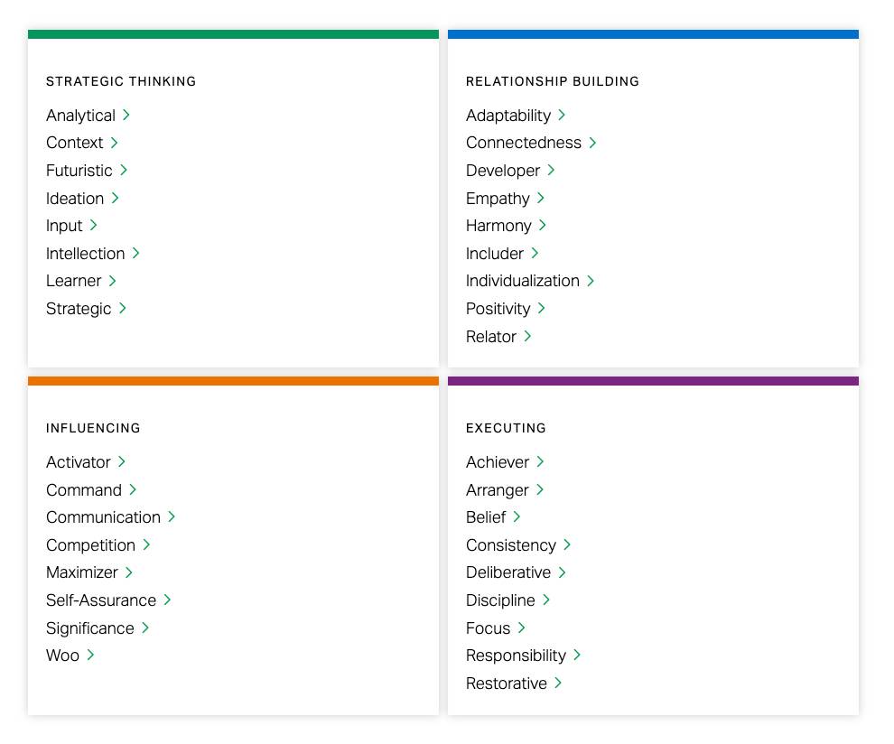 The four domains of CliftonStrengths®, including strategic thinking, relationship building, influencing and executing, and the 34 strengths indicators within.