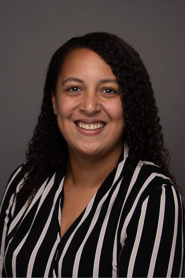 Justina Belle smiling for her GVSU headshot against with a dark gray background, wearing a black and white vertically striped blouse