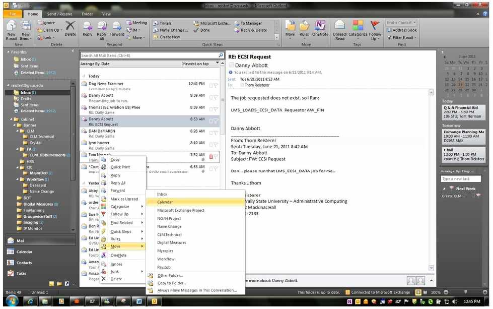 - Right-click on the email item and select Move from the list of options, then select Calendar from the sub-menu of options.