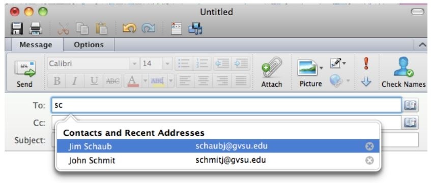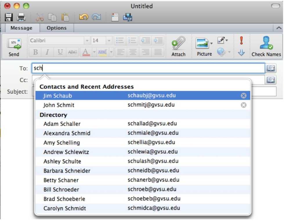- The address book in Outlook works differently than the address book worked in GroupWise. When you start to type a name in the To: field, a box will appear with possible matches. If there is a person who is in your recent contact list that matches the letters you are typing, their name will appear first. For instance, if I were to type “s” in the field a list of names would appear with the name of a person(s) I had recently contacted first and then the other names listed alphabetically.