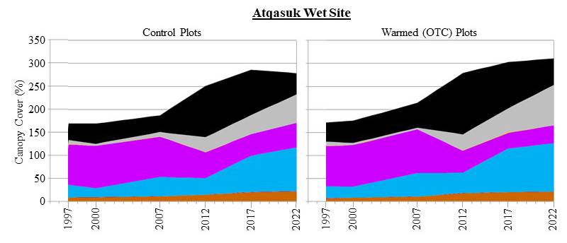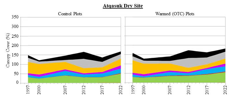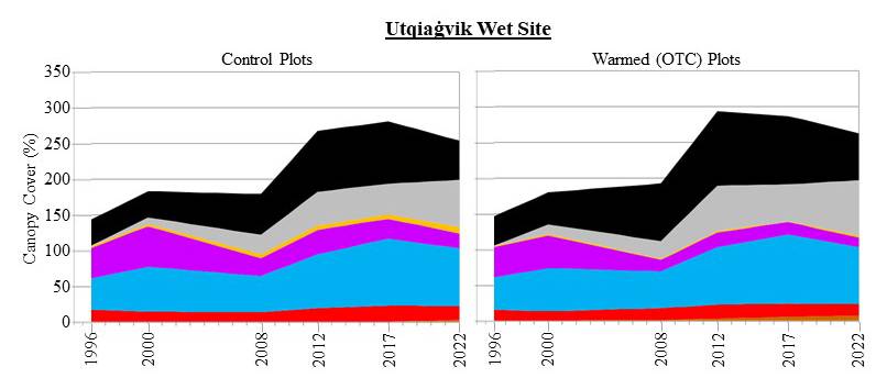 The graphs below show show these changes at several ITEX-AON research sites. The years when the vegetation was sampled is listed on the x-axis of each.
