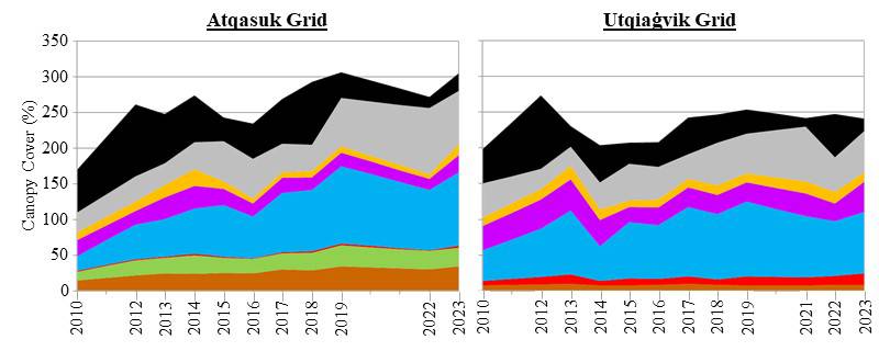 If you look across years you will see that the cover of vascular plants has increased greatly, going from less than 50% at most locations to as much as 150% at the Atqasuk Grid. You might ask how you can have more than 100%? The answer is simple: at each point on the pointframe, we record each "layer" of plants encountered. Since we may hit multiple layers of plants, cover percentages can rise above 100% as more layers appear through the years. Plants growing taller and closer together are what accounts for these dramatic increases.