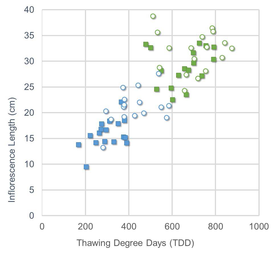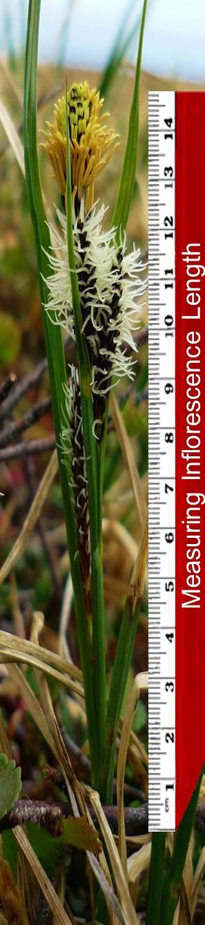 We have been conducting studies to better understand what factors influence plant growth. One simple measurement is the inflorescence length of the sedge Carex aquatilis. The inflorescence is the stalk that holds the flowers, you could instead simply say how tall the plant is or plant height.