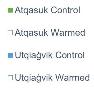 Measurements are taken in undisturbed control plots and in plots that are experimentally warmed at Utqiaġvik and Atqasuk. Both Utqiaġvik and Atqasuk are Arctic Tundra but Atqasuk is a little further south and a little warmer, especially during the summer because Utqiaġvik is coastal and has cool winds coming from the ocean.
