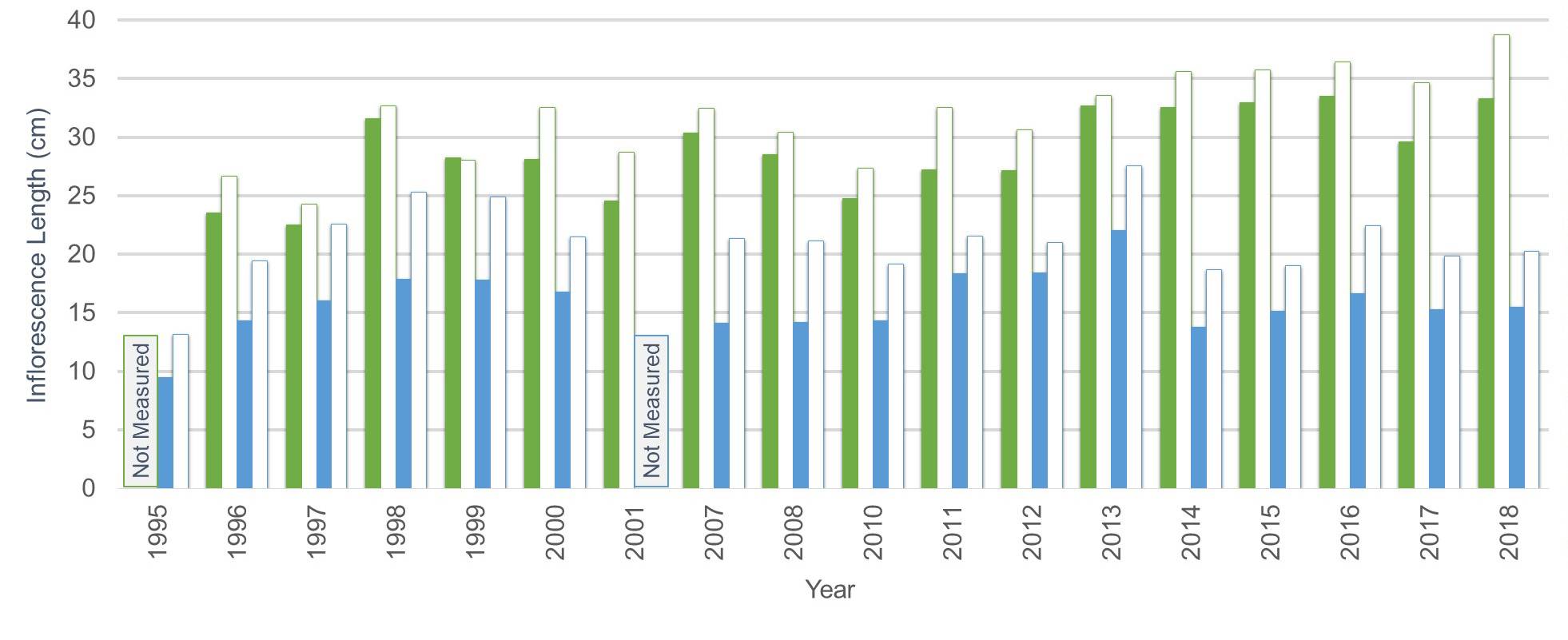 Below are two different graphs showing the length of the inflorescence of Carex measured at different locations in different years.