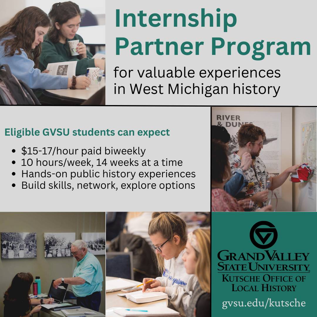 The Kutsche Office of Local History is excited to announce that we have partnered with the Grand Rapids African American Museum and Archives to host a student intern for the Winter 2026 semester. This is an excellent opportunity to experience the day-to-day operations of a museum, including learning about researching, developing, and maintaining exhibits! Majors in history or museum-related fields are preferred. A detailed description of the internship can be found here.