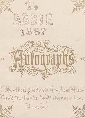 Although dating from the Middle Ages, the autograph album became very popular in the latter part of the 19th century. They were used to collect signatures of family members, friends, neighbors, and classmates and often displayed examples of fine penmanship, personal sentiments, verse, and drawings. Many varieties of commercially-available albums were produced, often with color lithograph vignettes on some pages; format was usually oblong with the average size being about 4½ x 7 inches. Examples in this collection were all owned by Michigan residents.