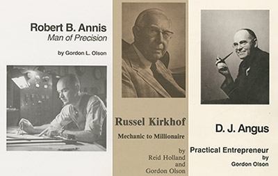 Gordon Olson, historian and researcher wrote a series of biographical essays for Grand Valley State College. Subjects included major donors including Russel Kirkhof, D.J. Angus, Robert B. Annis, Fred M. Keller, Seymour K. Padnos, L. V. Eberhard, William G. Jackson, Leslie E. Tassell, and Clare Jarecki. Materials include taped and transcribed interviews, drafts of publications, copies of articles and personal and career related information about the subject of each biography.