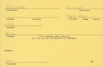 Card index of place names used as an authority file by the United States Department of the Interior in the Geological Survey in the 1976 Topographic Maps of Michigan project. Grand Valley State faculty Robert Alotta created these cards with student assistance. The card index of Michigan place names may include the following fields of information: Place name, map source, latitude, longitude, elevation, township, range quarter, remarks and researcher initials. Each card also has a category for the type of place (river, mountain, plain, city, dry river bed, church, lake, railroad).