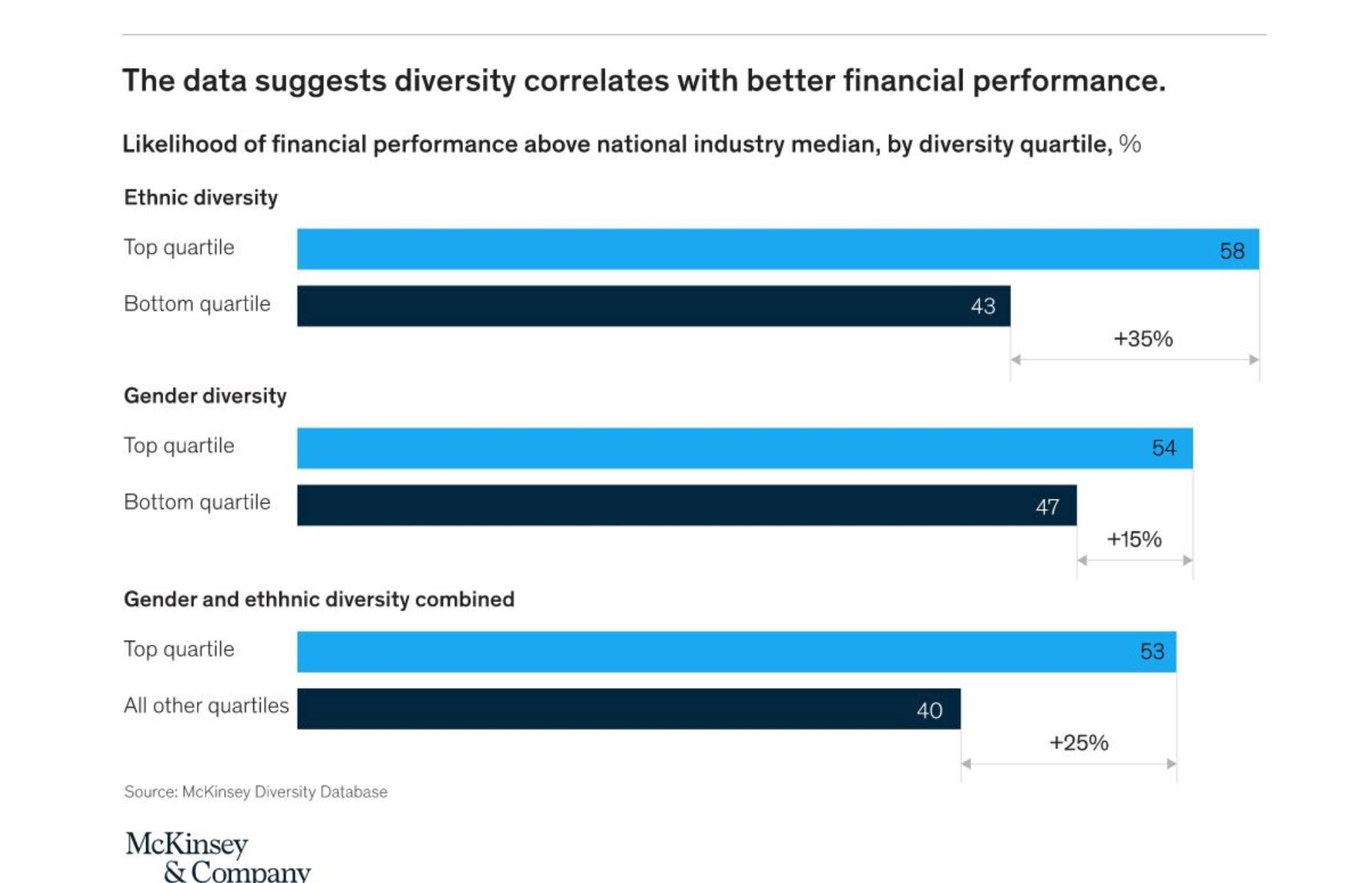 - Companies in the top quartile for racial and ethnic diversity are 35 percent more likely to have financial returns above their respective national industry medians.
