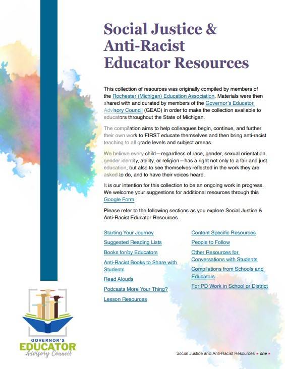 The Proclamation for Social Justice written by Governor Whitmer’s Educator Advisory Council is a document that serves as a timely reminder of our moral imperative in Michigan. There should be no inequities among groups of children, least of all based on race. We see these as fault lines that will only exacerbate the problems of our society. We see these discrepancies in education as a call to conscience for us all. Classrooms are some of the most powerful places in the world, and this proclamation is a commitment to the children of our state that we will use our power for good.