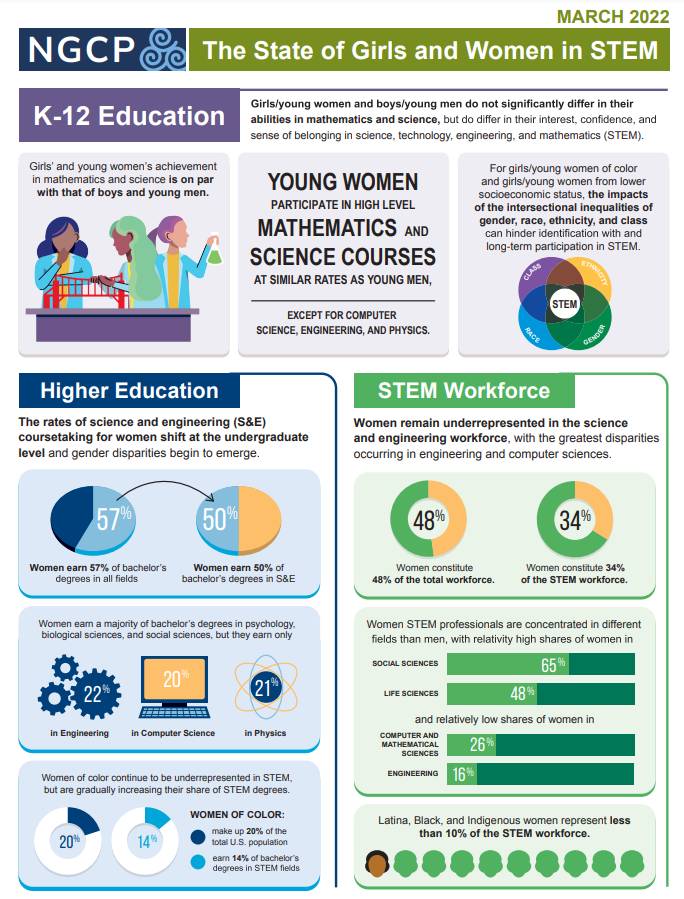 Created annually by NGCP, this resource presents a high-level summary of the most compelling statistics and research on the state of girls and women in STEM, focused on K-12 Education, Higher Education, and the STEM Workforce.