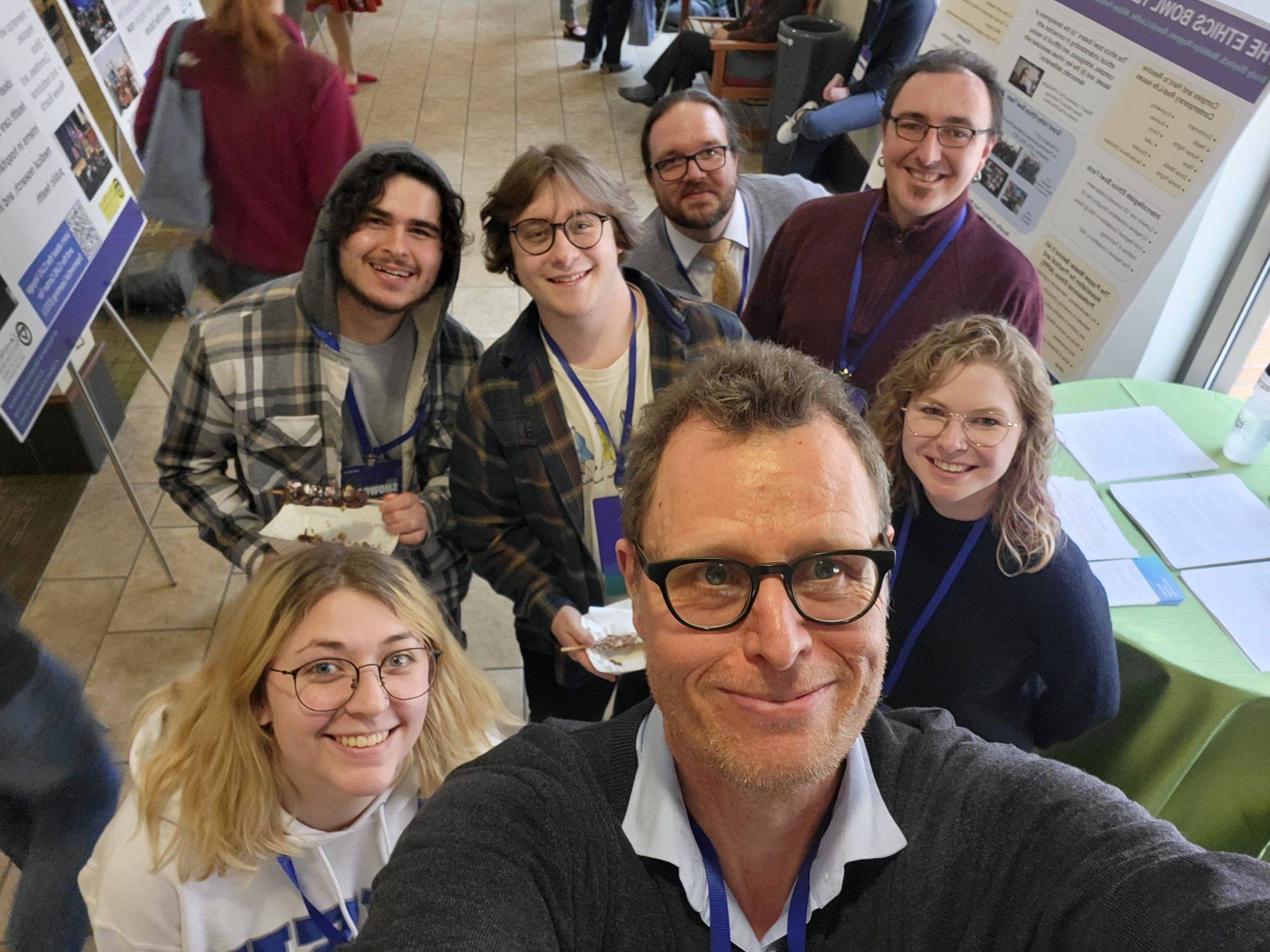 Ethic's Bowl Team 2022-23; Clockwise left to right: Maddelyn Koppers, Luis Zambrano, Brody Blaylock, Prof. Jeff Byrnes, Prof. William Parkhurst, Rachel Robinson, Prof. Ronald Loeffler.