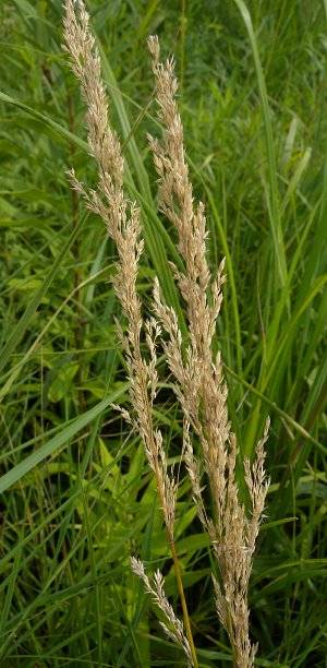 Very common grass up to 1.5m; found in large clumps especially in drainage ditches; flowers in spikelets in club-like masses (֎compound spike), stamens and pistils borne in same spikelet without spines, not all on one side; shores, swales, wet meadows; lemma with 2 tufts of silky hairs at base; can be highly invasive.