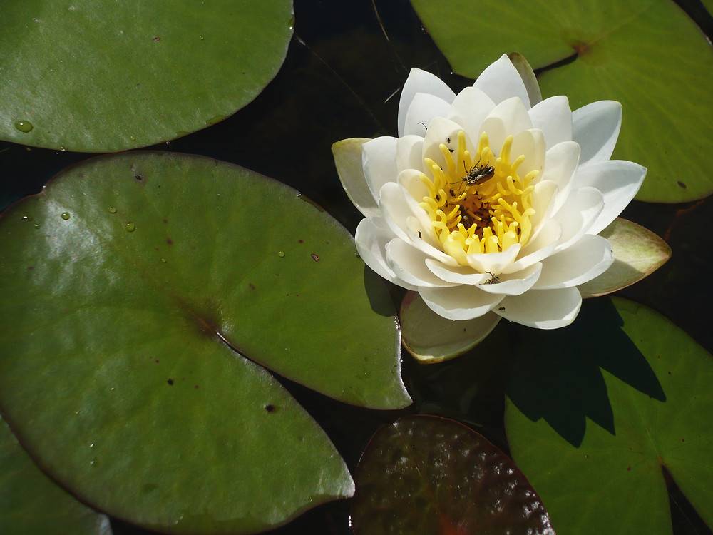 Floating herb; large floating leaves, ֎nearly round in shape with a ֎v-shaped cleft (vampire teeth); underground stem (rhizome) thick and fleshy (֎weak stem, leaf floats directly on water surface); floating flower is white, fragrant with ֎numerous petals and stamens; marshes and ponds, 10-55cm deep.