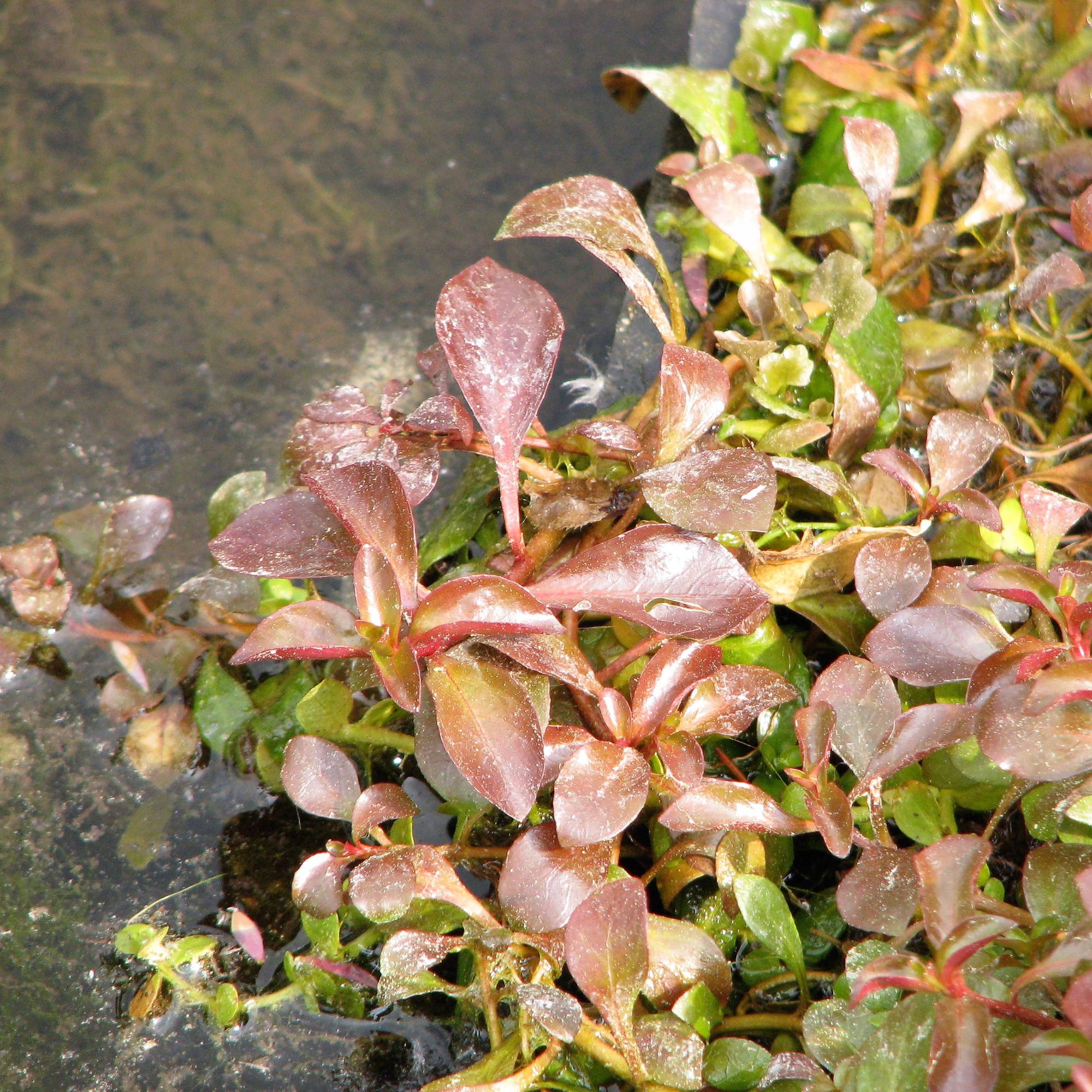 Aquatic herb preferring wet soils but can live indefinitely underwater; ֎leaves opposite, ovate to lance-shaped, green to red in color, best recognized by a ֎red bottom (only prominent with high light intensity), tapered at base to ֎winged petiole; stems poor, creeping or partially floating, branched to simple, smooth or with sparse scattered hairs; flowers stalkless and single from leaf axils, petals absent and sepals triangular; fruit a capsule; July-September; shallow water or exposed mud on pond margins.