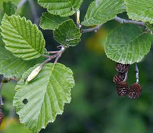 Thicket forming shrub up to 15’; leaves simple, dull above, whitened beneath, ֎doubly toothed, with blunt teeth; twigs and young leaves not sticky; male and females flowers separate on same plant, forming catkins; ֎female catkins cone-like and persisting for more than 1 year; male catkins long and flexible.
