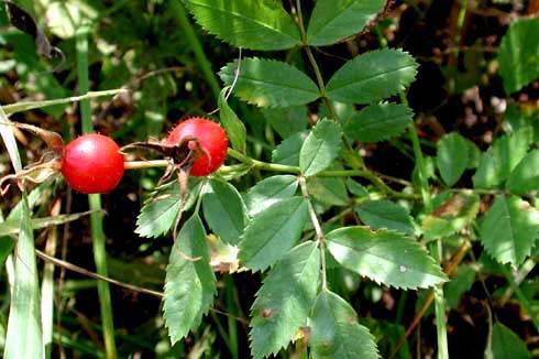 Highly branching prickly shrub; leaves with ֎stipules, alternate and ֎pinnately divided into usually seven leaflets; leaflets ֎fine toothed margins; twigs red-brown with ֎paired ֎downward curved ֎deciduous -prickles; ֎flowers single at terminal end of branches, strong ֎hypanthium; fruit round and reddish orange (edible ֎rose-hips) often with 5 sepals remaining; July-August; high prevalence in disturbed wetlands, moist to wet areas, open bogs.