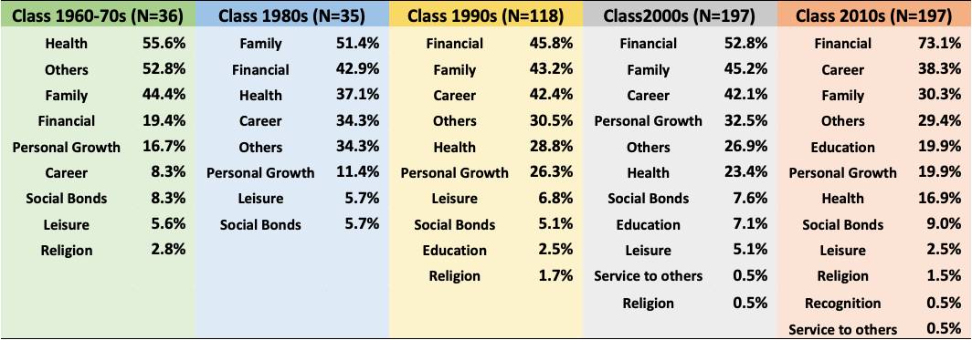 The following is a summary of the results on the responses to the question: What are the three most positive things in your life right now? After classifiyng the responses into the above 12 categories, we ranked ordered them by the percentage of alumni who mentioned a positive thing that was coded as a specific category for each of the graduation cohorts. For example, for those who graduated in the 1960s or 1970s, 94.6% mentioned something related to family as one of the three most positive things in their lives.
