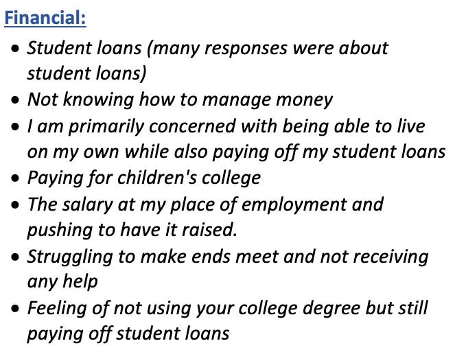 Given that the responses for challenges were much more varied than those for positive things, the following examples will give you a more concrete sense about what challenges our alumni reported facing in their lives.