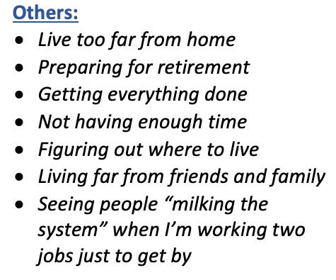 - Other (anything that could not be easily assigned to any of the above categories, such as location of residence, distance from work, politics, preparing for retirement)
