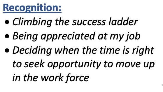 - Recognition/reputation/respect (social status relative to others, being distinctive and unique in one’s position, and being publicly acknowledged)