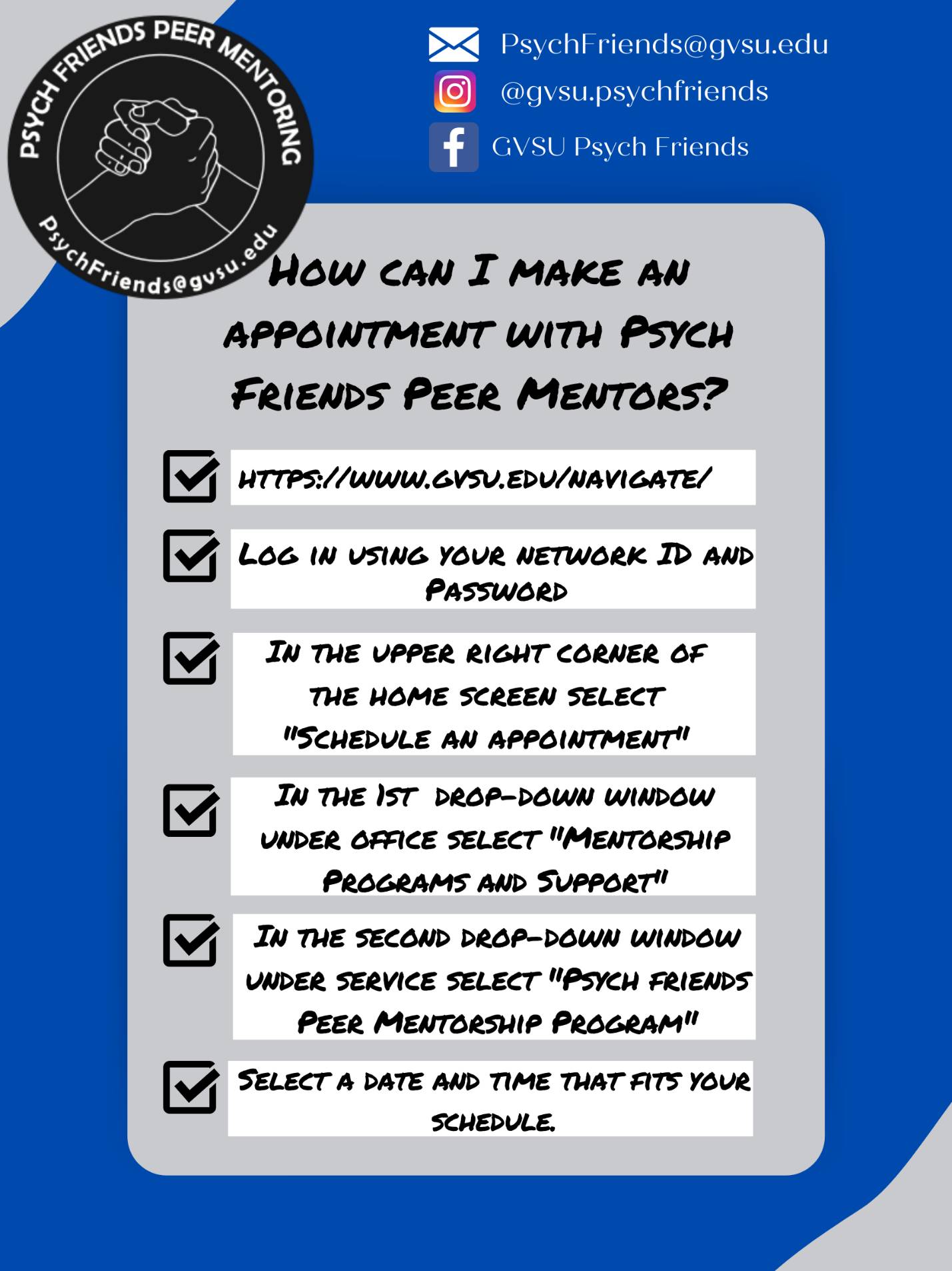To sign up for an appointment, click on the following link https://www.gvsu.edu/navigate/. Select “Schedule an appointment,” then select “Mentorship Programs and Support” and “Psych Friends Peer Mentorship Program.”