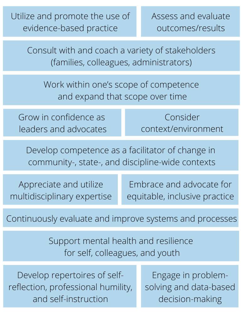 School psychologists strive to expand their scope of competence through self-reflection and engagement in professional growth. Individuals actively use their disciplinary expertise to serve as leaders, to coach and train others in their schools, and to be advocates for positive change in their communities of practice.