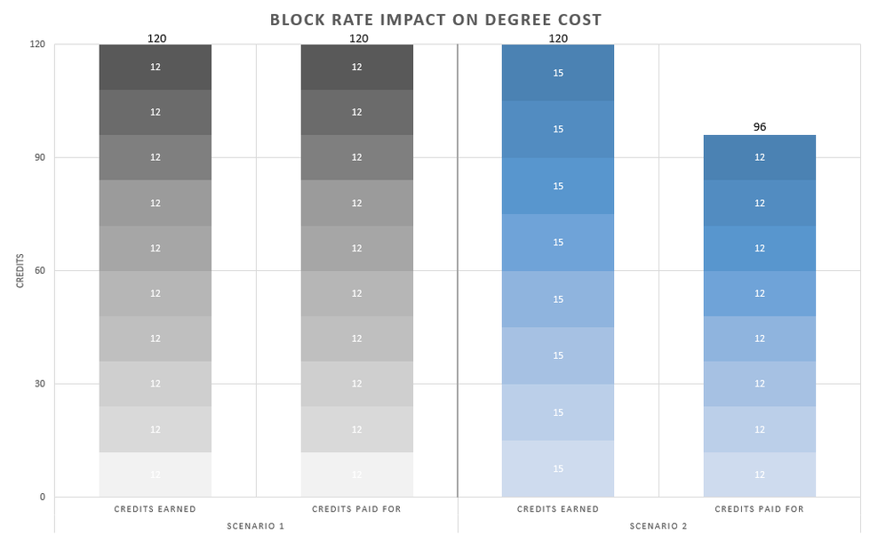 Scenario 1: Students enrolled in 12 credits per semester won't be using the block rate. These students will accumulate 120 credits in five years and will have paid tuition for 120 credits.