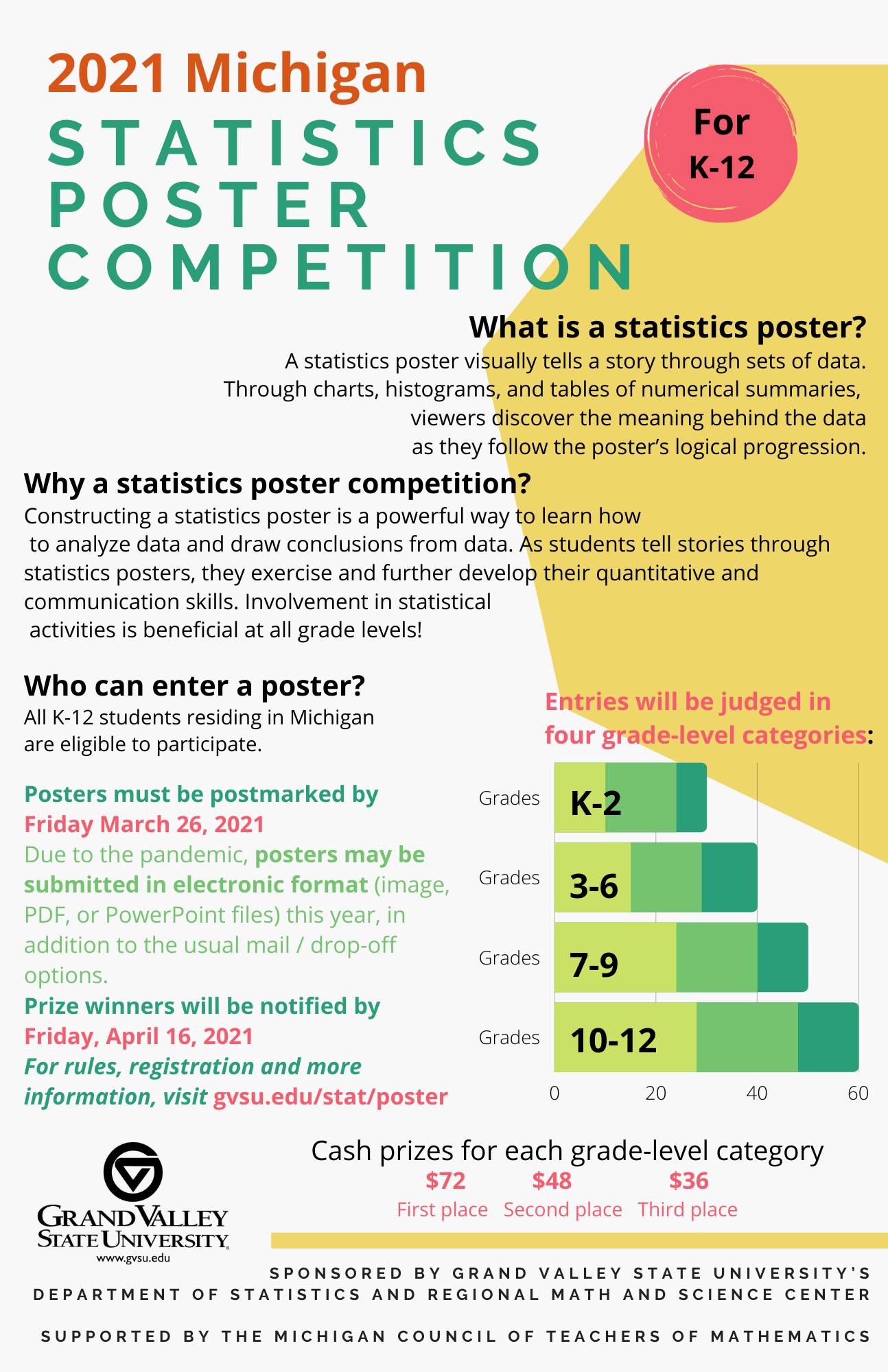 The Department of Statistics at Grand Valley State University (GVSU), the Regional Math and Science Center at GVSU, and the Michigan Council of Teachers of Mathematics are pleased to announce the 2021 Michigan Statistics Poster Competition for K-12.
